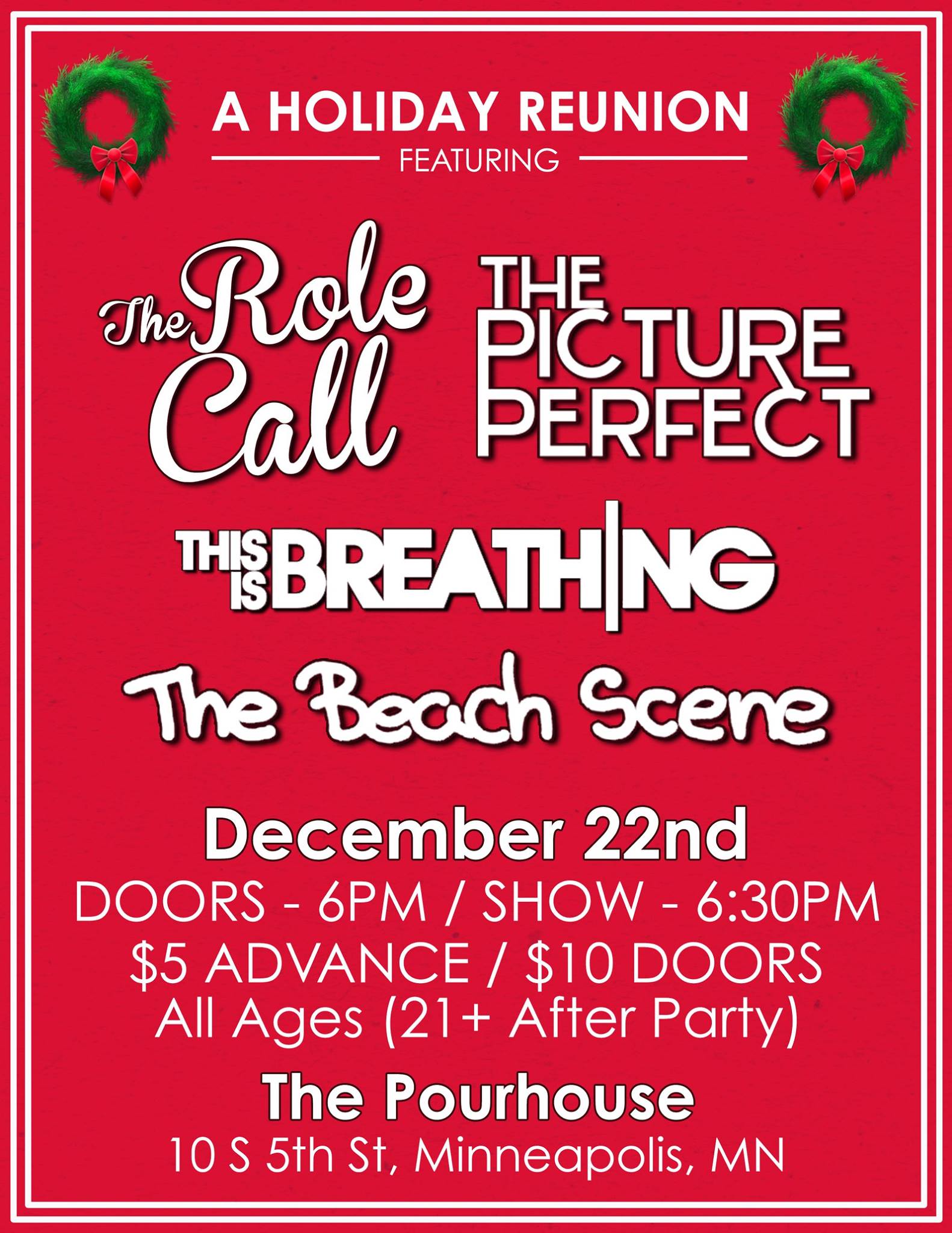Announced today via facebook, on December 22nd The Pourhouse in Minneapolis will be hosting a “Holiday Reunion” show. This show features a lineup entirely of previously broken up bands coming together for one more show in the spirit of the Holiday season. The bill includes The Beach Scene, a poppunk band from Eden Prairie that broke up in late 2011, This is Breathing, a pop-rock band from St. Paul that broke up back in 2013, The Picture Perfect, from Eau Claire who played their last show nearly two years ago, and The Role Call, an alternative band from Minneapolis who broke up in 2014. The show will be $10 at the door and is all ages, there will be 21+ afterparty following the show. You can click here to RSVP to the show via facebook!